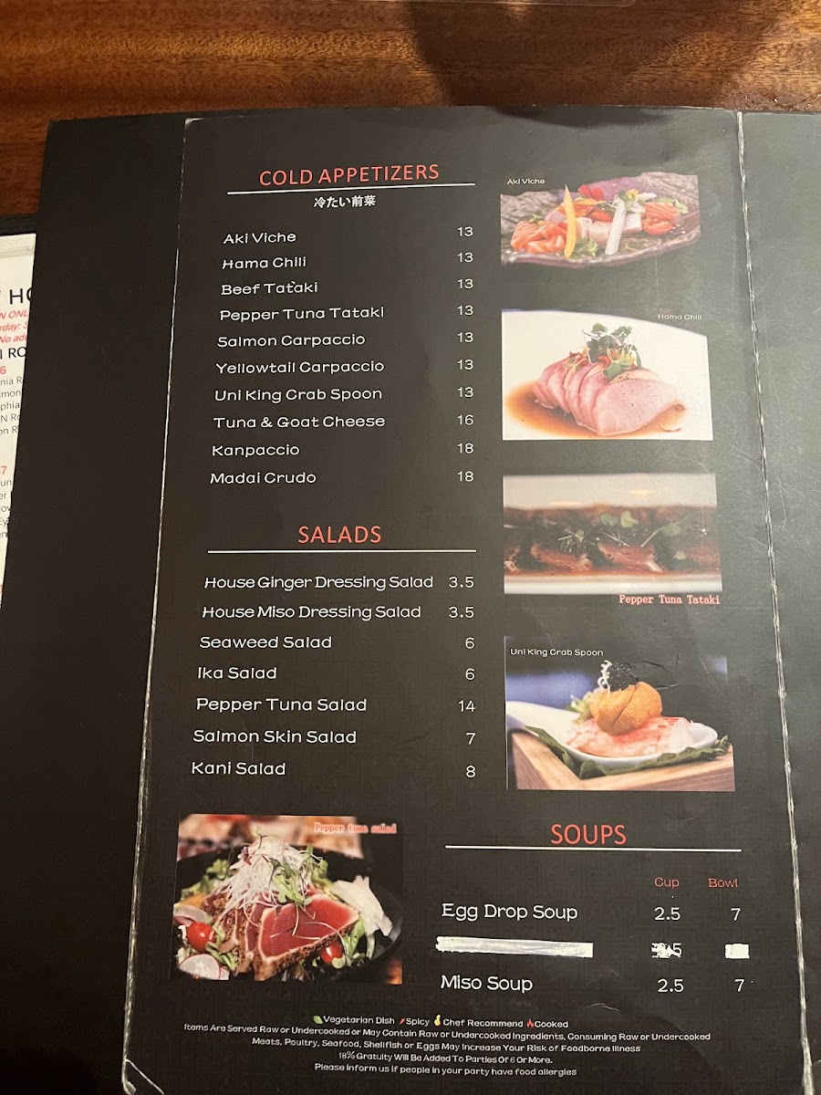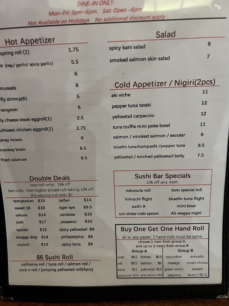 Inside: kani mix, avocado, cucumber Top: layer of tuna, and layer of salmon Sauce & Topping: pink salt, black tobiko, green onions, and fried smoked salmon skin strips